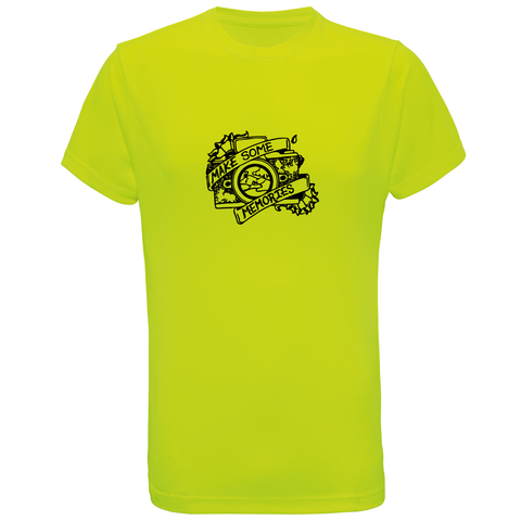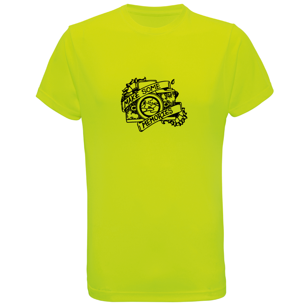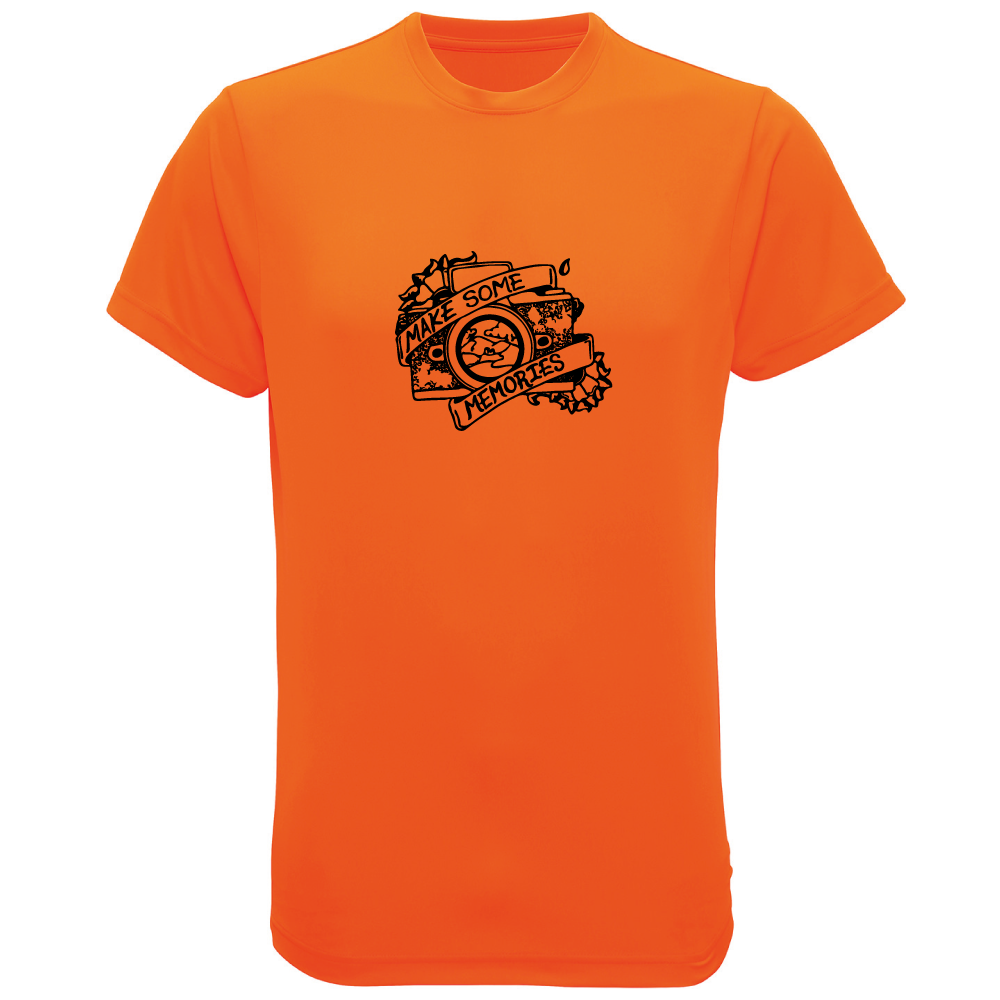 Make some memories while wearing this t-shirt, which has a typical tattoo-style image of a camera with a lens facing you and a landscape scene surrounded by flowers, along with a banner that says "Make some memories" in a handwritten font.