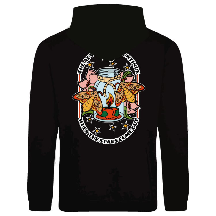 Chase adventure long after the stars rise with this limited edition design on a hoodie, or zoodie featuring a bold, tattoo-inspired design of two moths circling a candle-lit jar. Framed by cherry blossoms, starlight, and traditional tattoo linework, this piece is perfect for fans of moth art, night-time aesthetics, mystical nature themes, celestial vibes, and neo-traditional tattoo style. A modern twist on classic symbolism, made for those who live for the night.