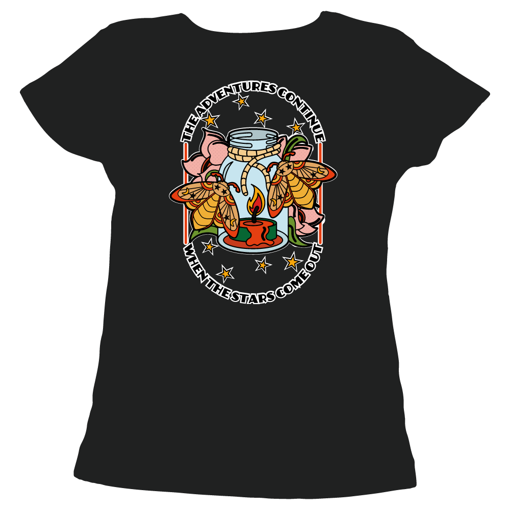 Chase adventure long after the stars rise with our limited edition colour version of this bold, tattoo-inspired design which features two moths on a candle-lit jar, surrounded by cherry blossoms, starlight, and traditional tattoo linework. Perfect for lovers of moth art, night-time aesthetic, mystical nature designs, celestial themes, and neo-traditional tattoo style, this artwork brings a modern twist to classic symbolism.