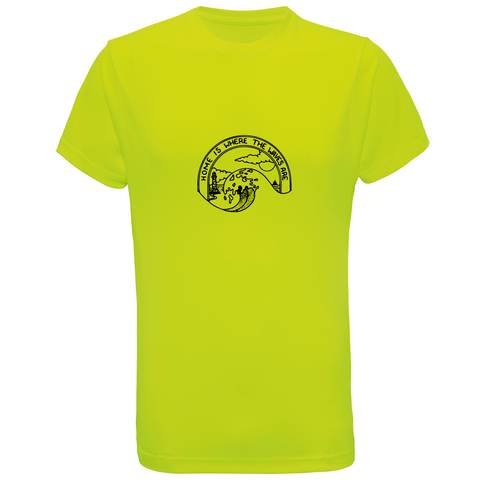 Embrace your love for the ocean with our Home Is Where The Waves Are surfing-themed t-shirt. This eye-catching tee features a captivating half-circle logo design that showcases a serene seascape, complete with rugged rocks, a charming lighthouse, and a majestic cruise ship under a sunlit sky. A massive wave crashes dramatically in the foreground, perfectly encapsulating the essence of coastal life. The stylishly scrawled phrase “Home Is Where The Waves Are” adds a personal touch to this unique design.