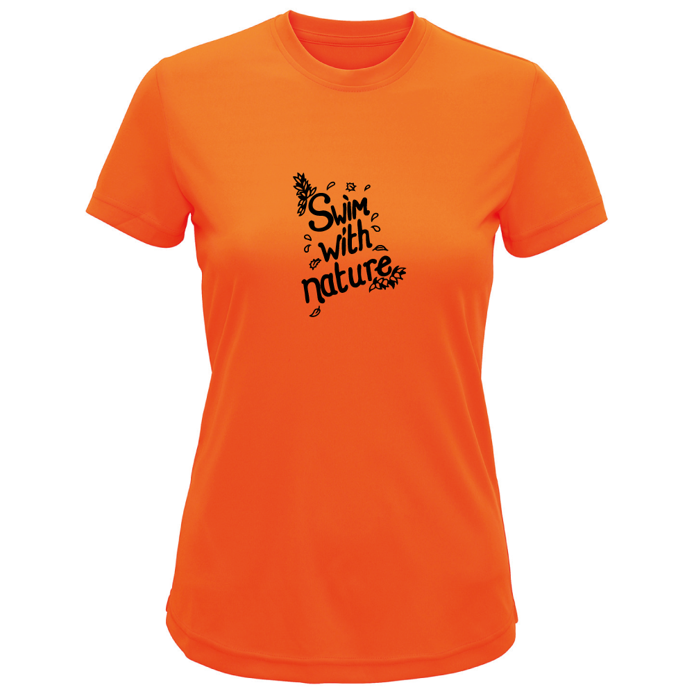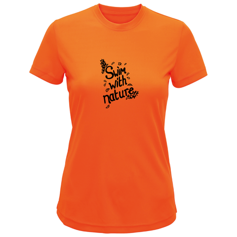 Dive into adventure with our Swim With Nature wild swimming themed ladies t-shirt. This beautiful design features handwritten typography alongside delicate illustrations of floating leaves, perfectly capturing your love for swimming in the great outdoors. Whether you’re taking a refreshing dip in a serene lake or exploring a wild river, this t-shirt will proudly showcase your passion for immersing yourself in nature.